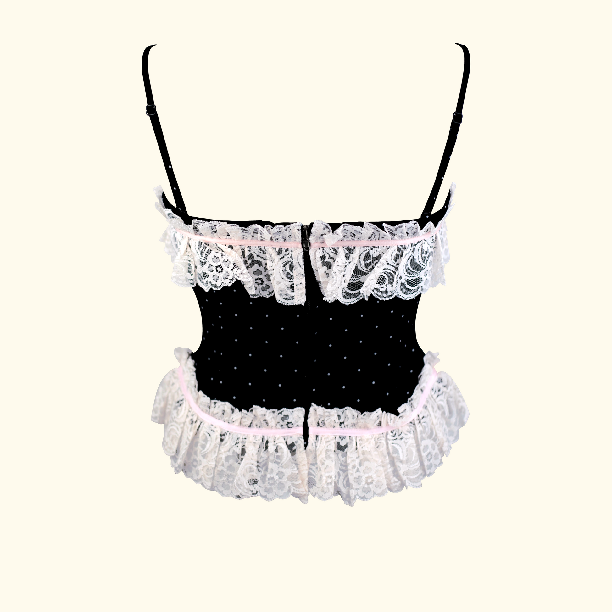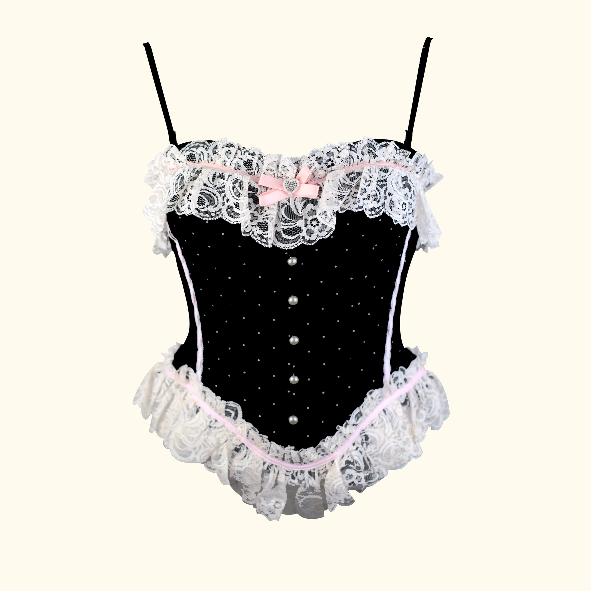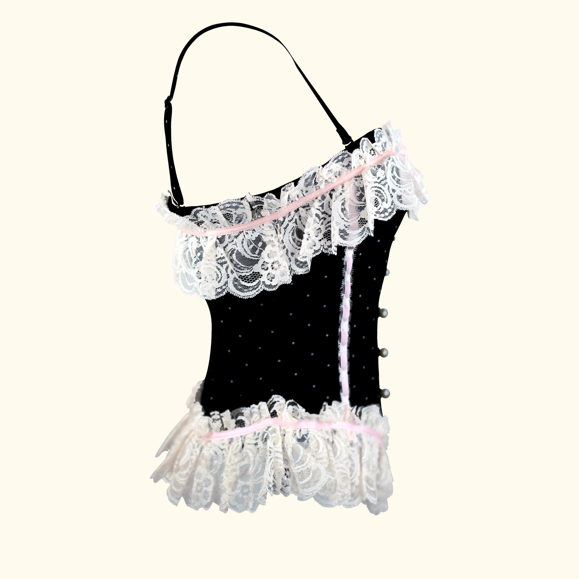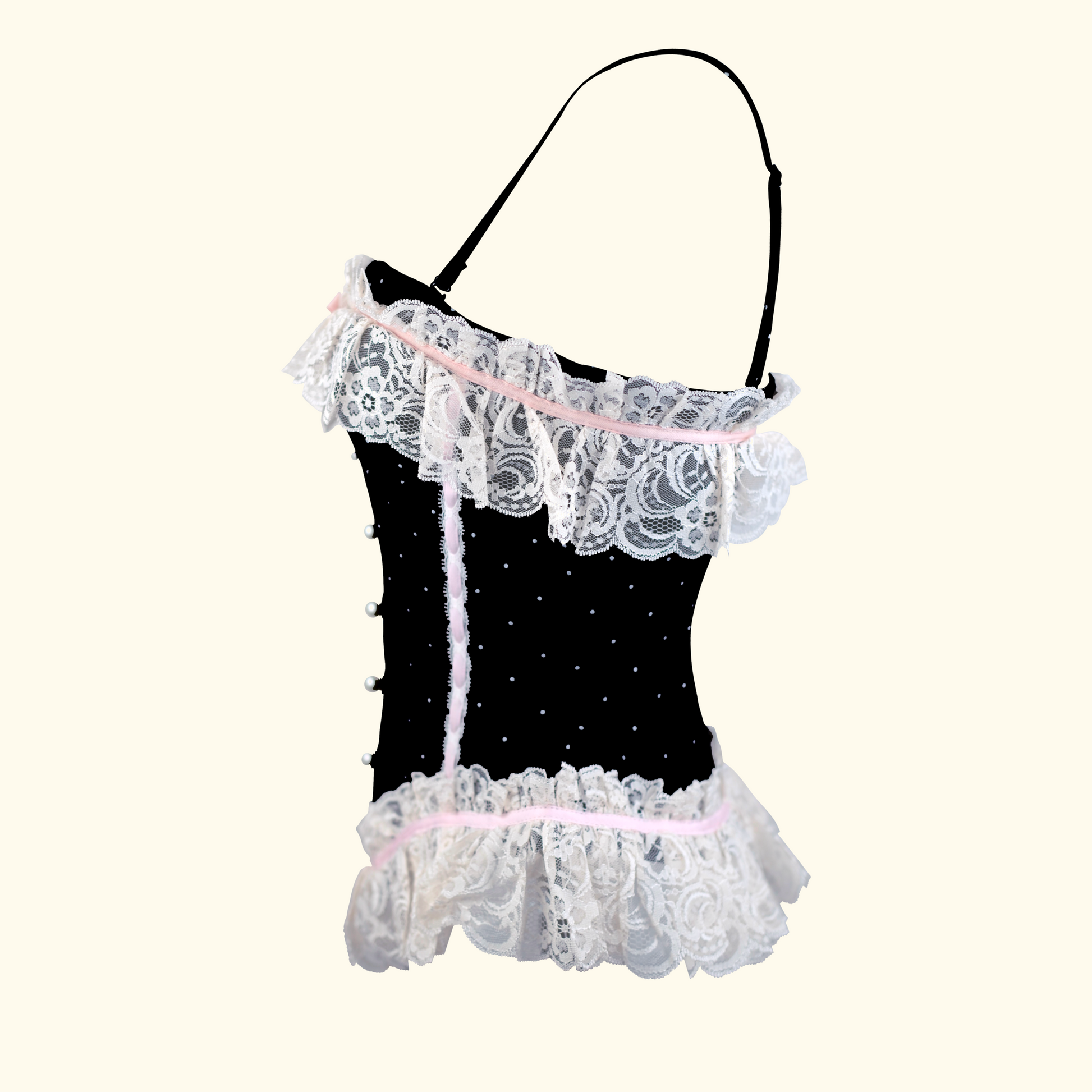 Inspired by vintage porcelain dolls, this set masterfully blends innocent lace and playful polka dots on the bustier with a voluminous, cloud-like tulle skirt. It captures a (sweet but not cloying) charm, perfect for birthday parties, Lolita-themed photoshoots, and dates, highlighting a unique (girlish sensibility).