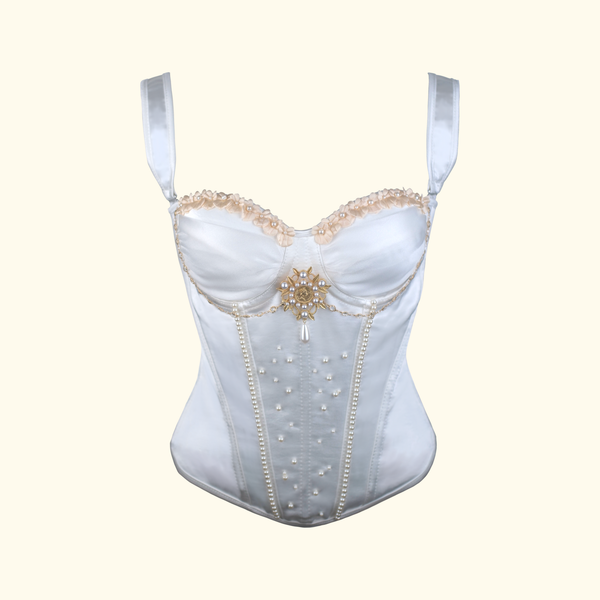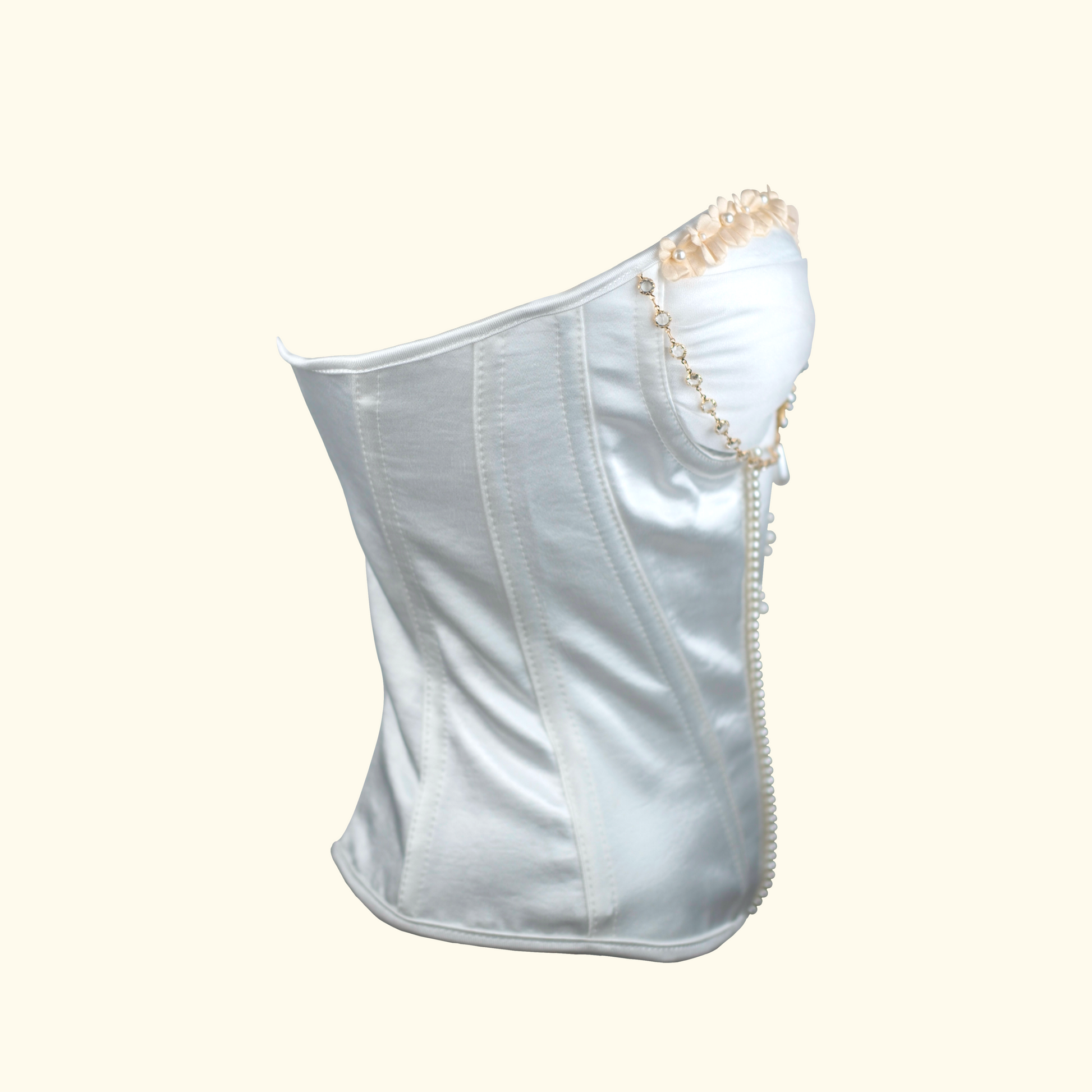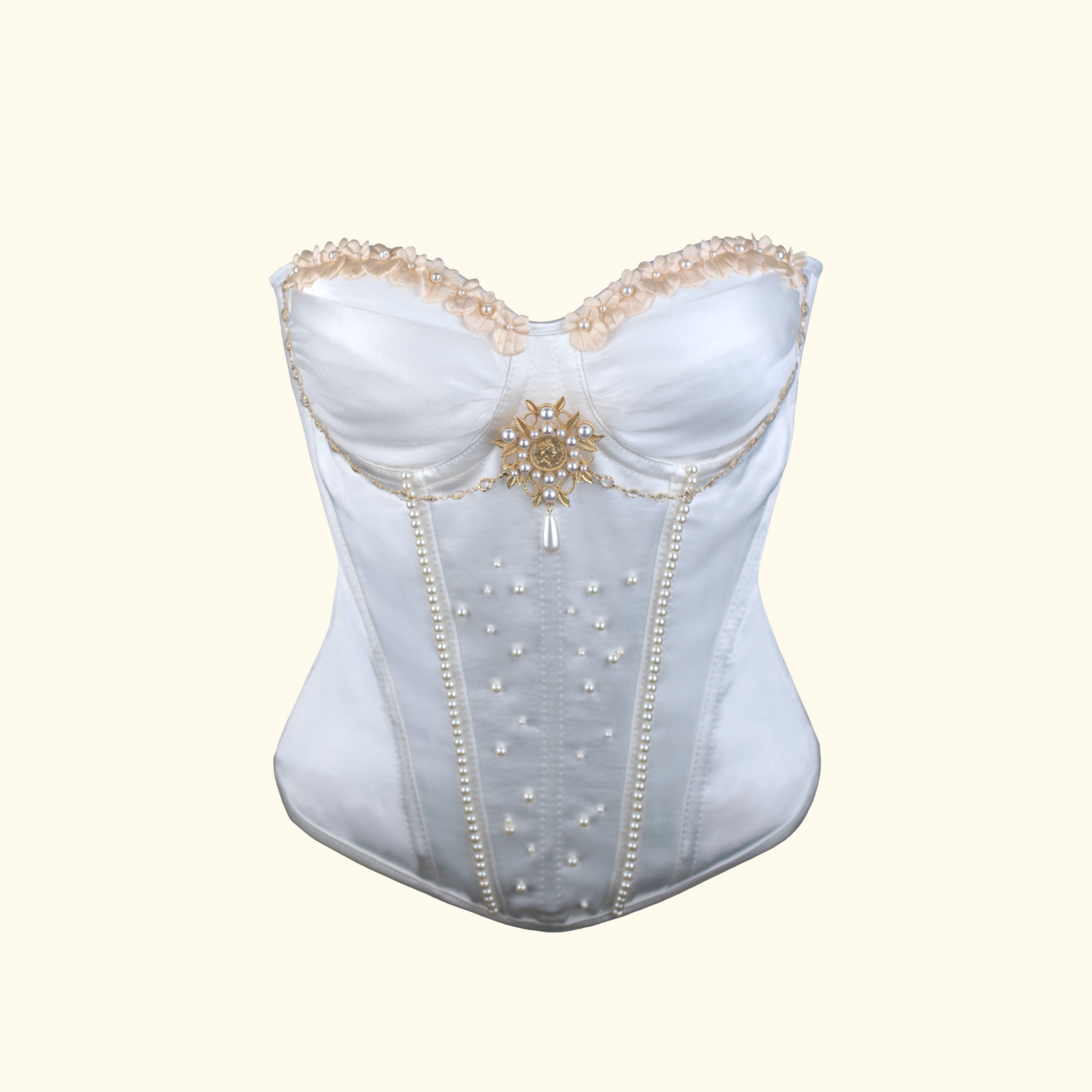 Offers versatile styling with both a strapless bustier and detachable straps. The neckline features meticulously crafted 3D flowers, delicate gold bead chains, and high-quality metal hardware, showcasing精湛工艺 (exquisite craftsmanship) and adding layers of奢华感 (opulence).