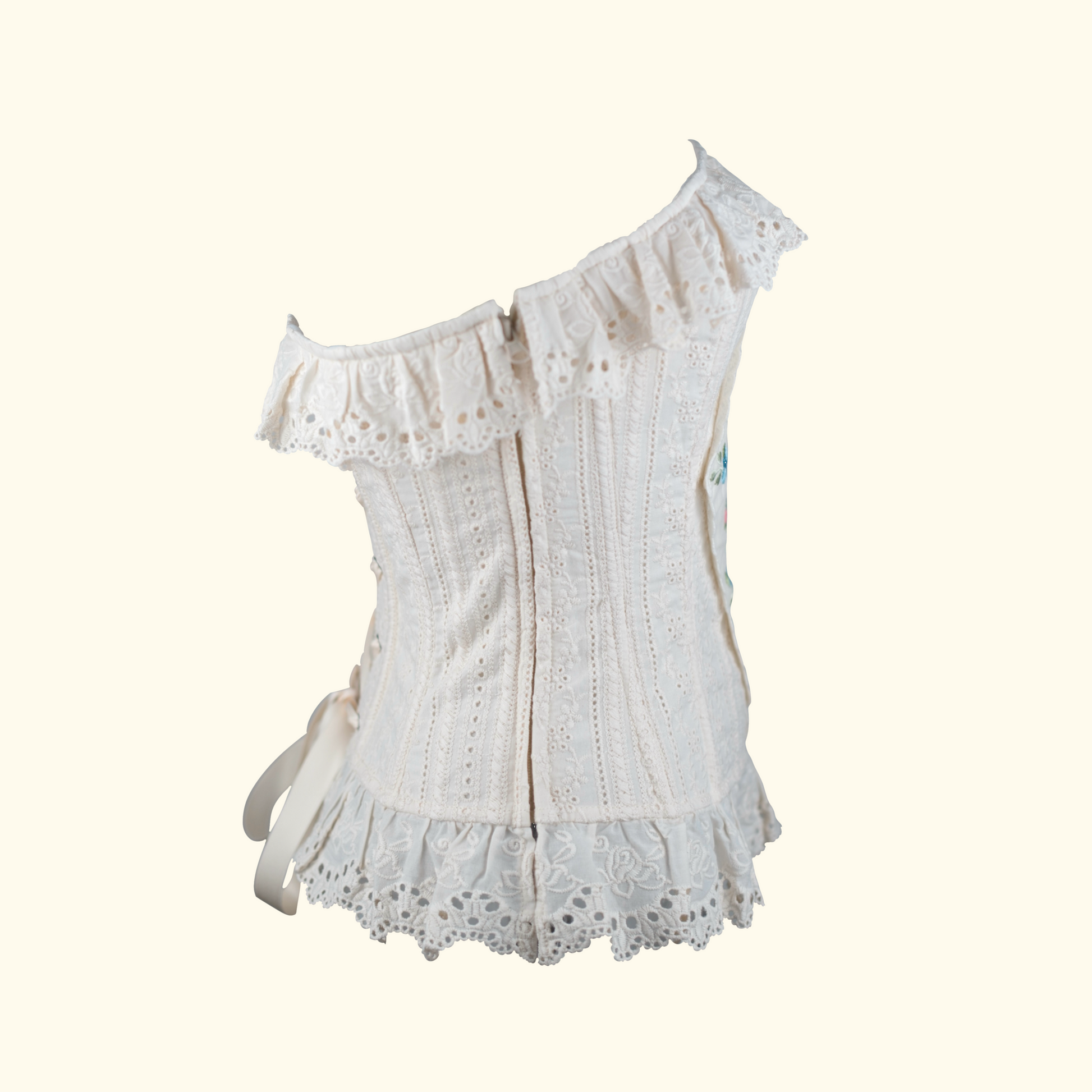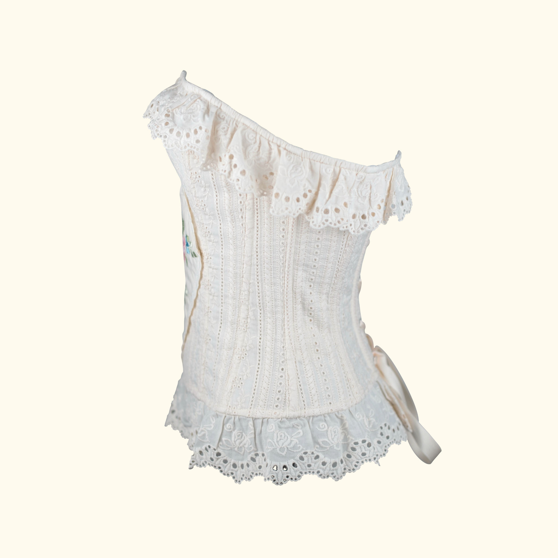 Adorned with intricate three-dimensional rose embroidery, featuring meticulous stitching and soft, harmonious colors. This exquisite detail breaks the monotony of a solid-colored bustier, elevating the entire piece with unparalleled refinement.