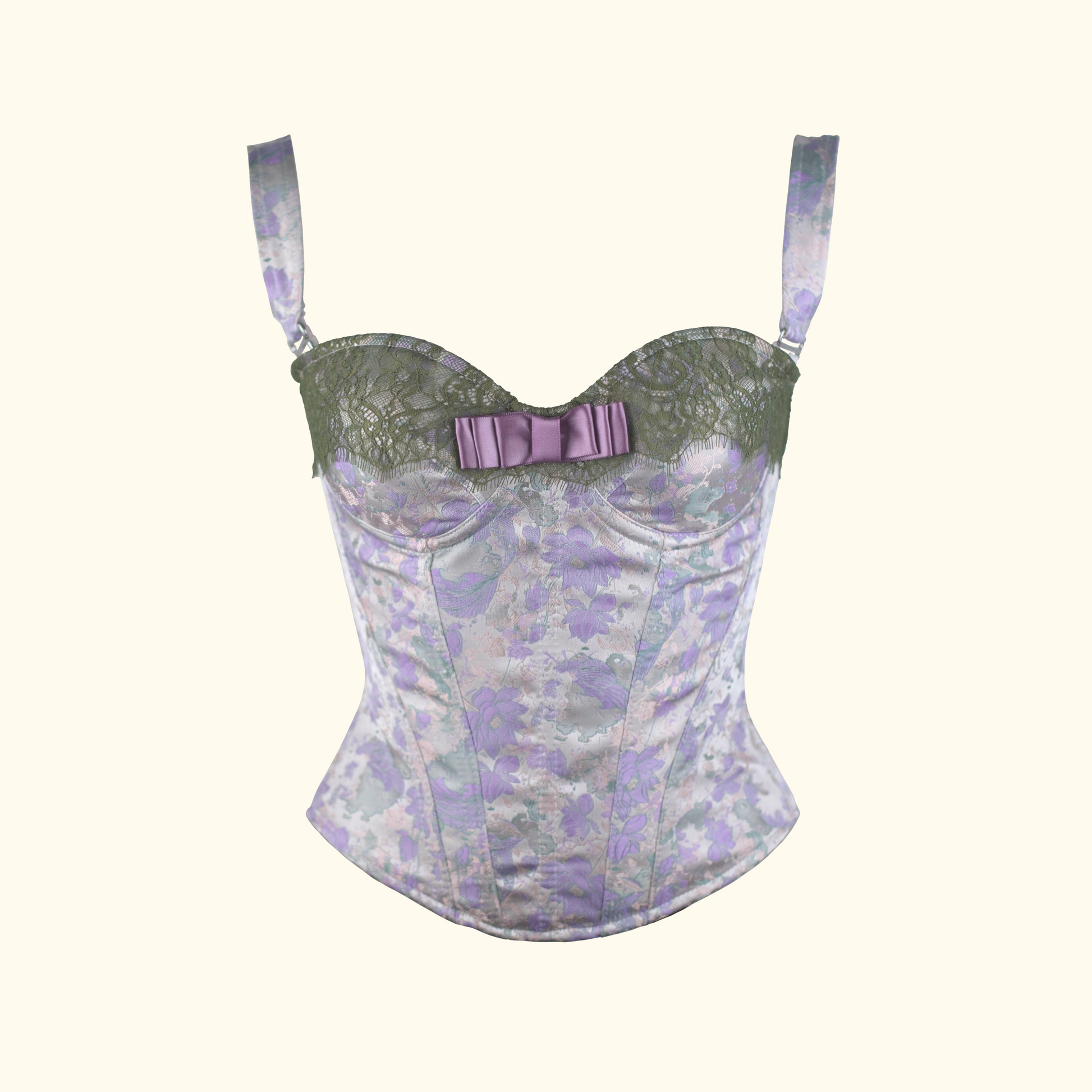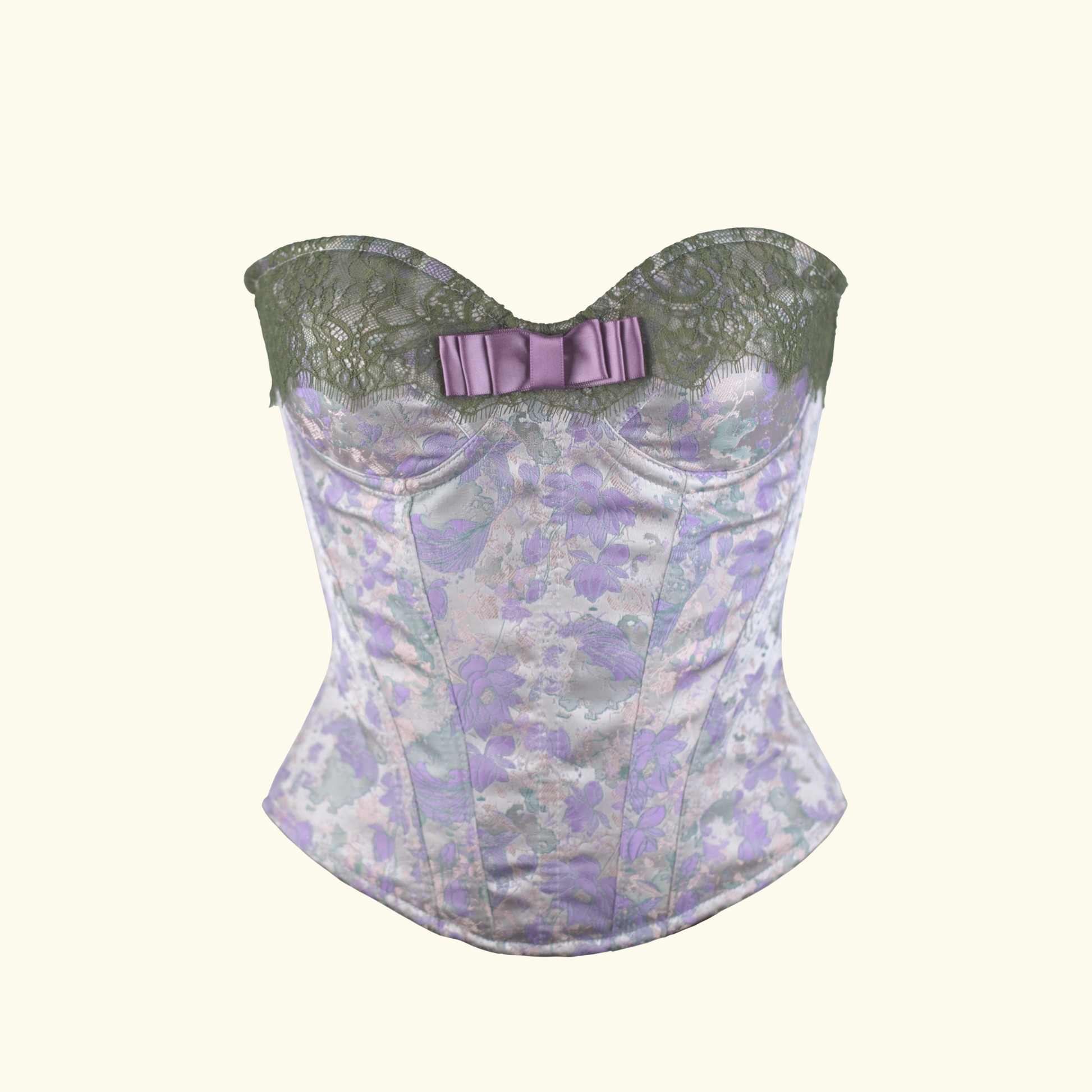Inspired by French vintage aesthetics, this piece features a delicate lilac jacquard pattern beautifully combined with lace inserts. Adorned with a refined purple bow, it creates a visual effect as serene and elegant as a "water lily," perfect for crafting a sophisticated, retro-inspired or niche luxury look.