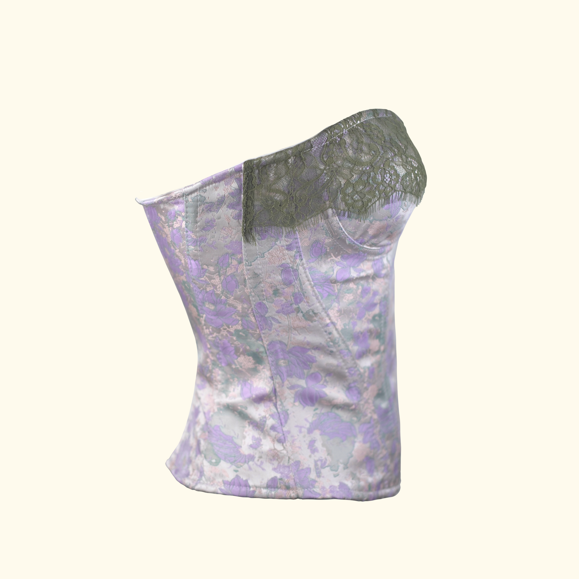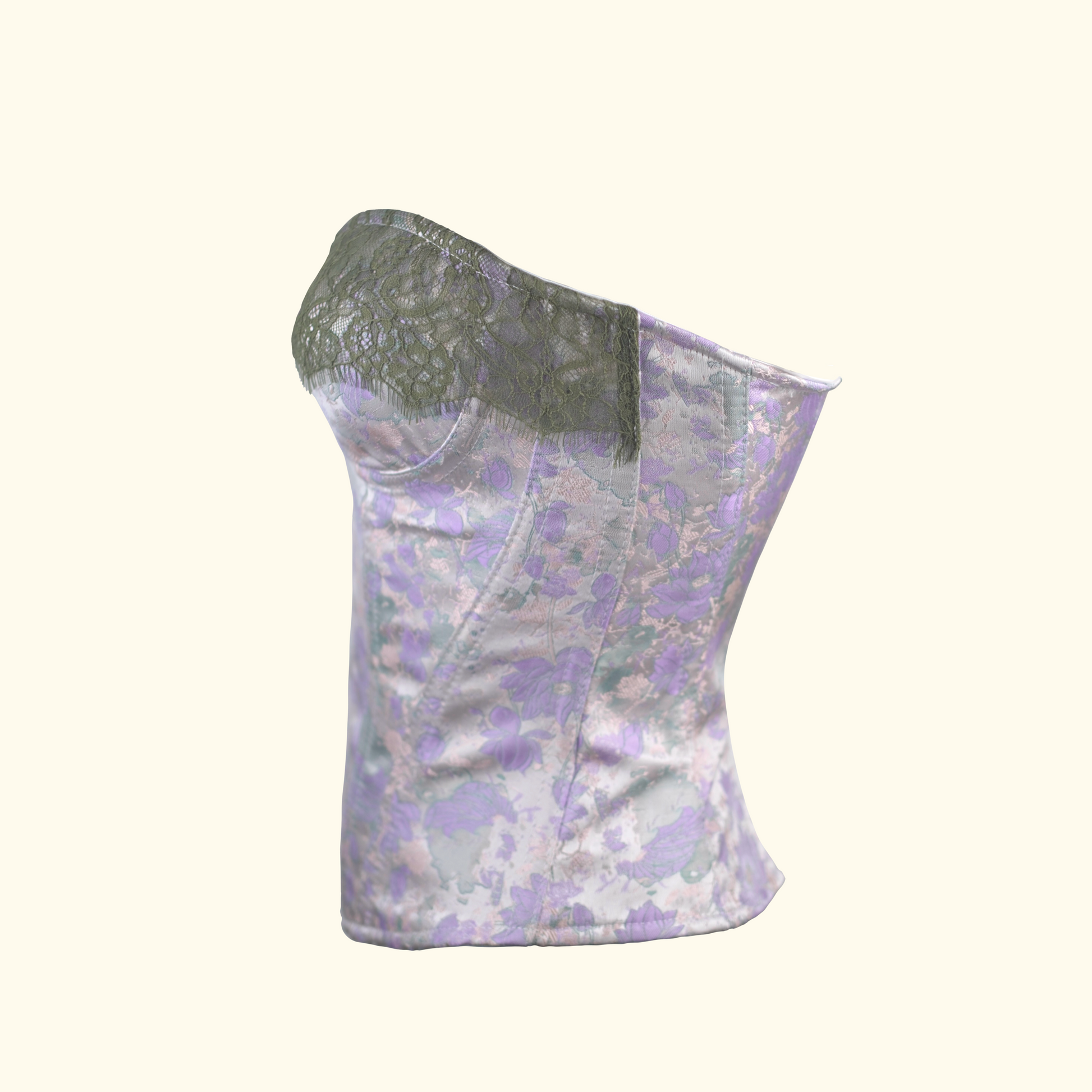 Offers versatile styling with both a strapless bustier and detachable straps. The neckline features exquisite jacquard and lace拼接 (piecing), with a细腻图案 (delicate pattern) and high-quality lace, enhancing the overall design and detail.